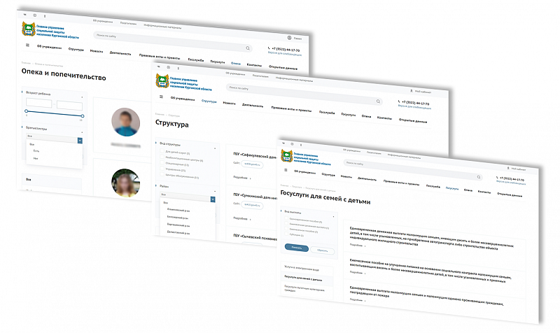 Сайты социальной защиты Курганской области представляли из себя основной сайт ГУ и сайты подведомственных учреждений, размещенных на разных доменах и платформах, зачастую не имеющих собственного управления. Также все сайты, включая сайт ГУ уже устарели, не имели мобильных версий и использовали неудобную навигацию, также отсутствовал полный поиск по содержимому.